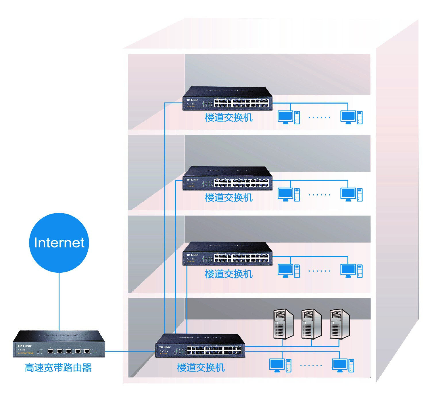 交換機(jī)使用TP-LINK樓道型交換機(jī),可以支持端口隔離,VLAN,以及端口帶寬控制可以徹底杜絕內(nèi)網(wǎng)ARP欺騙,p2p攻擊。