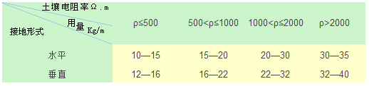 降阻劑的經(jīng)濟(jì)用量應(yīng)視不同的土壤而定,在接地體上的敷設(shè)厚度應(yīng)在5—15CM之間,為方便計算,推薦用量如下表: